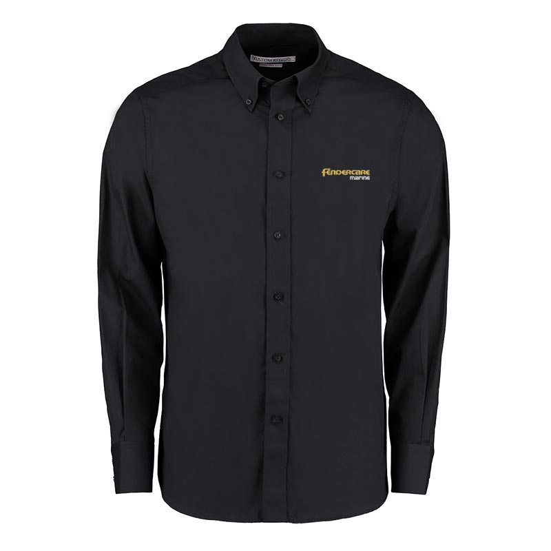 Fused collar. Stand up button down collar. Single needle stitched armholes. Twin needle stitched Sleeve and side seams. Back yoke. Rounded hem. 2 spare buttons. Woven Kustom Kit® label.